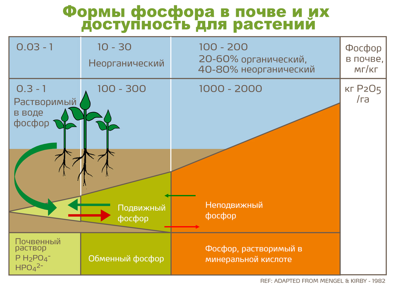 В почве существует, как правило, два пула фосфора. В один пул входит неподвижный, труднодоступный фосфор в составе таких соединений, как фосфат кальция. Из труднодоступного пула фосфор переходит в другой, легкодоступный пул, и со временем запасы в первом пуле истощаются. Из легкодоступного пула фосфор поступает в почвенный раствор, откуда затем усваивается растениями.